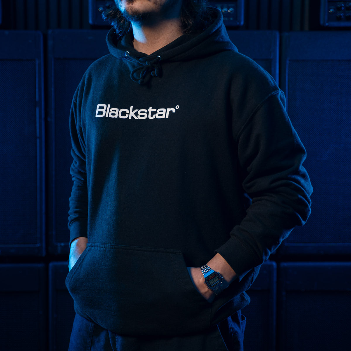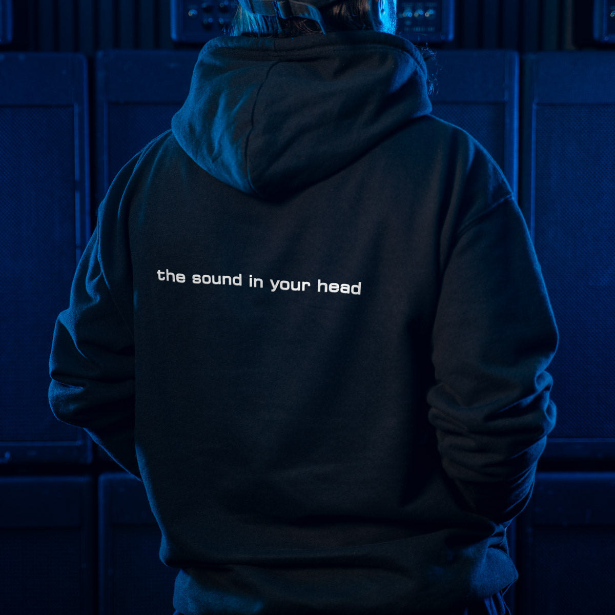 Original Blackstar logo, black hoodie with the iconic tagline 'the sound in your head' printed in white on the reverse
