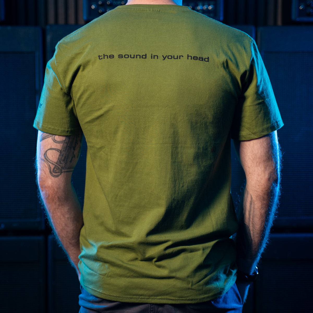 Star khaki t-shirt with the iconic tagline 'the sound in your head' on the reverse in black print